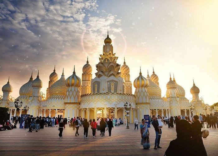 Visitors can expect a vibrant and immersive cultural experience at Global Village Dubai, with pavilions representing countries from around the world. Guests can explore international crafts, souvenirs, and merchandise while enjoying live performances, street shows, and seasonal entertainment that bring the park to life. The colorful decorations and illuminated displays create a festive and lively atmosphere, perfect for evening visits.