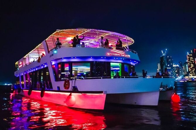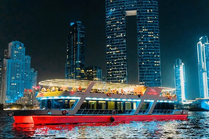 The cruise includes a scenic journey through Dubai Marina, buffet dinner with drinks, live entertainment, and indoor and open deck access for panoramic views.